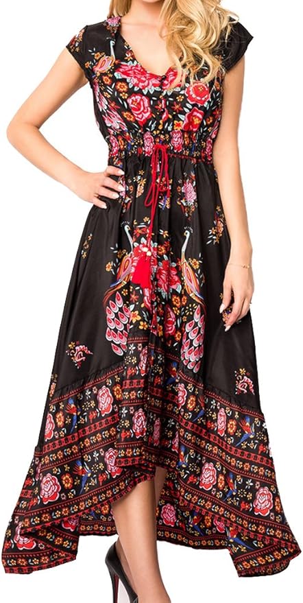 Unbekannt Schwarzes Langes Kleid Mit Blumen Muster Tiefem Ausschnitt Und Bindeband An Der Taille M Amazon De Bekleidung