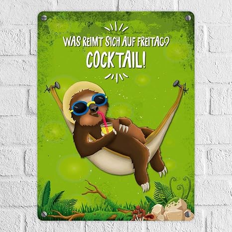 Trendaffe Metallschild Mit Faultier In Hangematte Motiv Und Spruch Was Reimt Sich Auf Freitag Cocktail Amazon De Garten