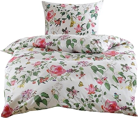 Mako Satin Blumen Bettwasche Mit Vogeln Und Schmetterlingen Weiss 155x200 80x80 100 Baumwolle Amazon De Kuche Haushalt
